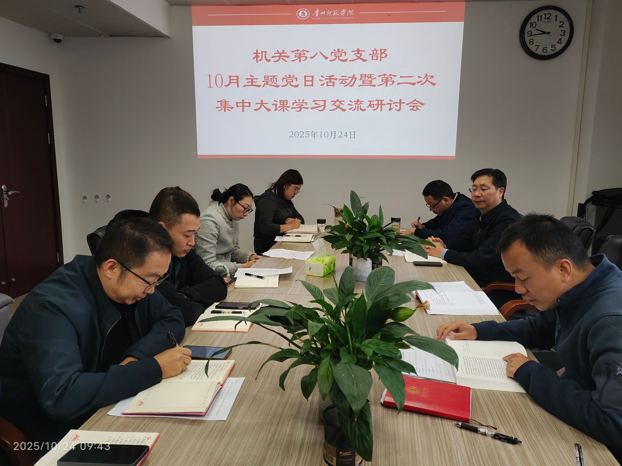 10月24日,机关第八党支部举行了10月份的主题党日活动暨党员基本培训第二次党员集中大课学习交流研讨会。集中学习阶段,会议传达了徐麟书记在贵州师范学院调研时的重要指示精神、贵州师范学院第三次党员代表大会的会议精神,认真学习了《习近平谈治国理政》(第5卷)中的相关内容,观看了党史学习纪录片《莆籍抗日英烈谱——陈文杞》,支部党员代表赵刚同志以《用高校的资产管理工作推进教育强国建设》为主题,上了一堂生动的微党课。
